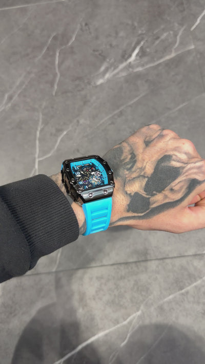 Orologio dal design sport-luxury con quadrante scheletrato blu e dettagli metallici. Cassa nera con viti a vista e cinturino in silicone azzurro per uno stile deciso e moderno. Perfetto per chi vuole farsi notare.
